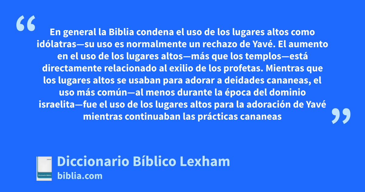 El rechazo de los lugares altos. En general la Biblia condena el uso de los lugares altos como idólatras—su uso es normalmente un rechazo de Yavé. El aumento en el uso de los lugares altos—más que los templos—está directamente relacionado al exilio de los profetas. Mientras que los lugares altos se usaban para adorar a deidades cananeas, el uso más común—al menos durante la época del dominio israelita—fue el uso de los lugares altos para la adoración de Yavé mientras continuaban las prácticas cananeas (Vos, “High Place”, BEB).