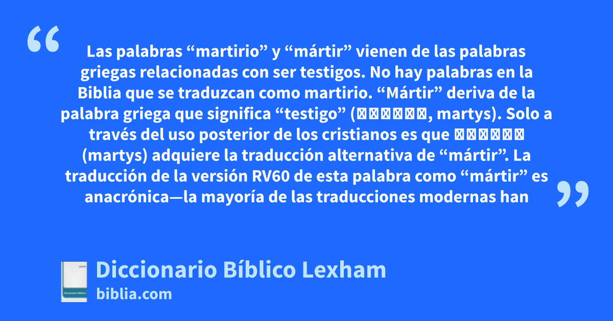 Las palabras “martirio” y “mártir” vienen de las palabras griegas relacionadas con ser testigos. No hay palabras en la Biblia que se traduzcan como martirio. “Mártir” deriva de la palabra griega que significa “testigo” (μάρτυς, martys). Solo a través del uso posterior de los cristianos es que μάρτυς (martys) adquiere la traducción alternativa de “mártir”. La traducción de la versión RV60 de esta palabra como “mártir” es anacrónica—la mayoría de las traducciones modernas han optado por la traducción mejorada de “testigos” (ej., LBLA, DHH, NTV).