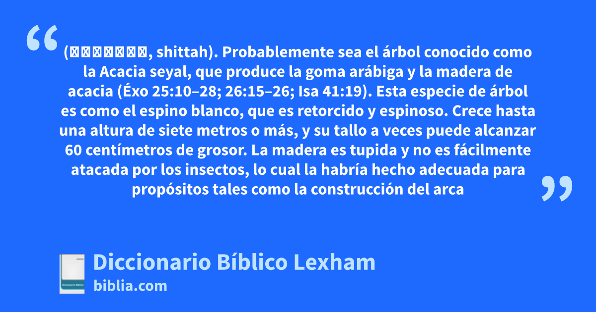 Acacia (שִׁטָּה, shittah). Probablemente sea el árbol conocido como la Acacia seyal, que produce la goma arábiga y la madera de acacia (Éxo 25:10–28; 26:15–26; Isa 41:19). Esta especie de árbol es como el espino blanco, que es retorcido y espinoso. Crece hasta una altura de siete metros o más, y su tallo a veces puede alcanzar 60 centímetros de grosor. La madera es tupida y no es fácilmente atacada por los insectos, lo cual la habría hecho adecuada para propósitos tales como la construcción del arca del pacto, del altar y de las tablas del tabernáculo. Se encuentra abundantemente en la península del Sinaí.