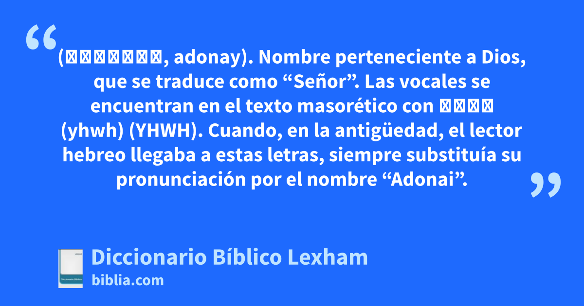 Adonai (אֲדֹנָי, adonay). Nombre perteneciente a Dios, que se traduce como “Señor”. Las vocales se encuentran en el texto masorético con יהוה (yhwh) (YHWH). Cuando, en la antigüedad, el lector hebreo llegaba a estas letras, siempre substituía su pronunciación por el nombre “Adonai”.