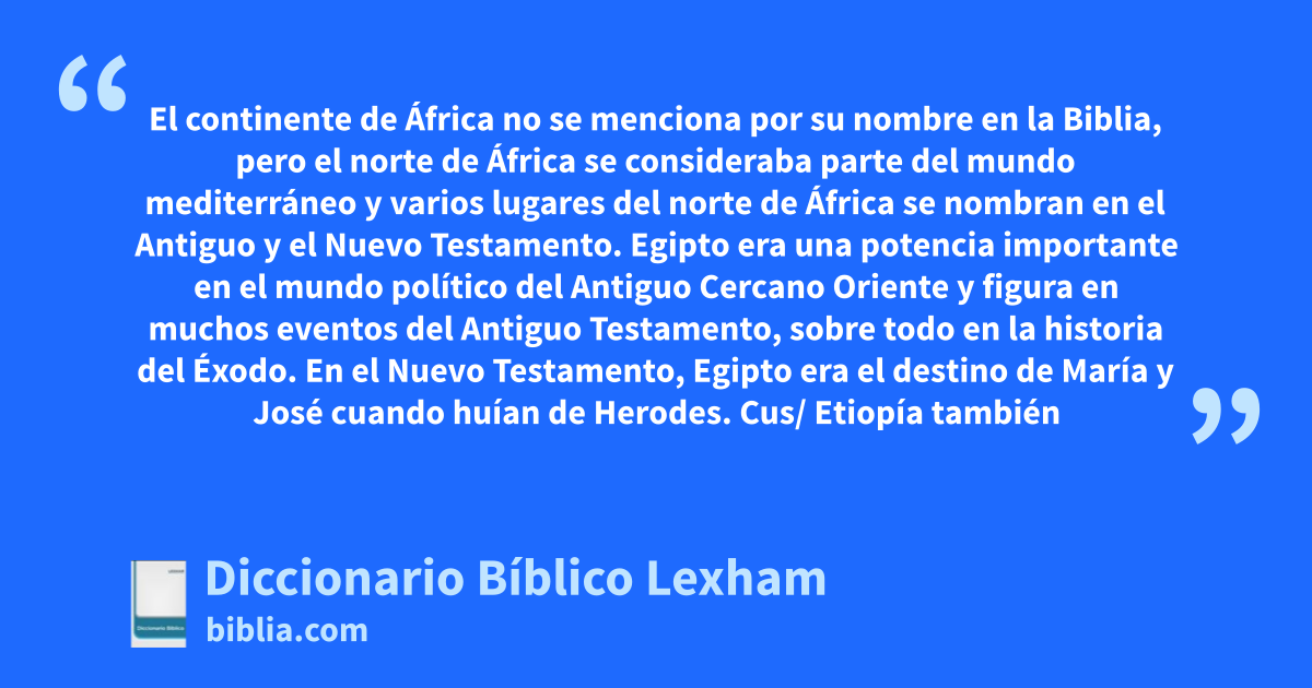 ÁfricaEl continente de África no se menciona por su nombre en la Biblia, pero el norte de África se consideraba parte del mundo mediterráneo y varios lugares del norte de África se nombran en el Antiguo y el Nuevo Testamento. Egipto era una potencia importante en el mundo político del Antiguo Cercano Oriente y figura en muchos eventos del Antiguo Testamento, sobre todo en la historia del Éxodo. En el Nuevo Testamento, Egipto era el destino de María y José cuando huían de Herodes. Cus/ Etiopía también fue importante. Felipe el evangelista bautizó a un eunuco etíope. En griego y latín, África del Norte se llamaba Libia; Cirene era su ciudad central.