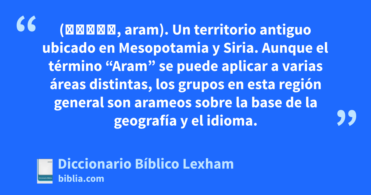 Aram (אֲרָם, aram). Un territorio antiguo ubicado en Mesopotamia y Siria. Aunque el término “Aram” se puede aplicar a varias áreas distintas, los grupos en esta región general son arameos sobre la base de la geografía y el idioma.