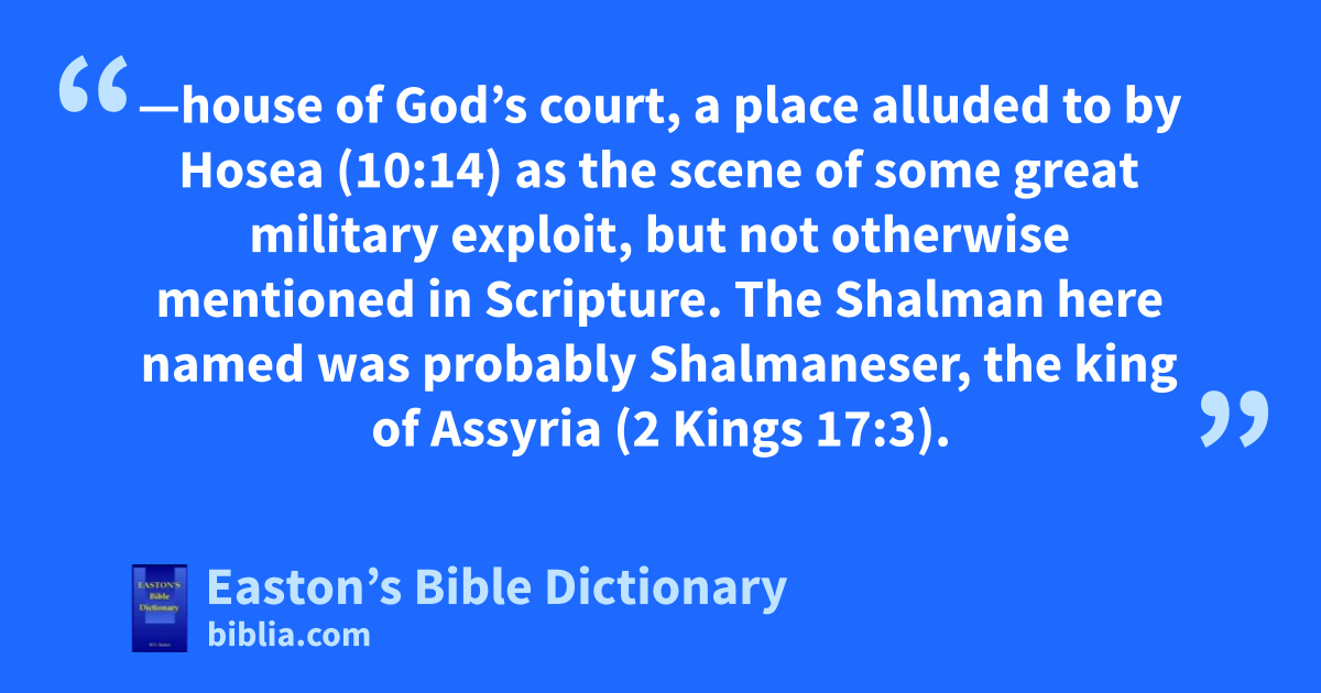 Beth-Arbel—house of God’s court, a place alluded to by Hosea (10:14) as the scene of some great military exploit, but not otherwise mentioned in Scripture. The Shalman here named was probably Shalmaneser, the king of Assyria (2 Kings 17:3).