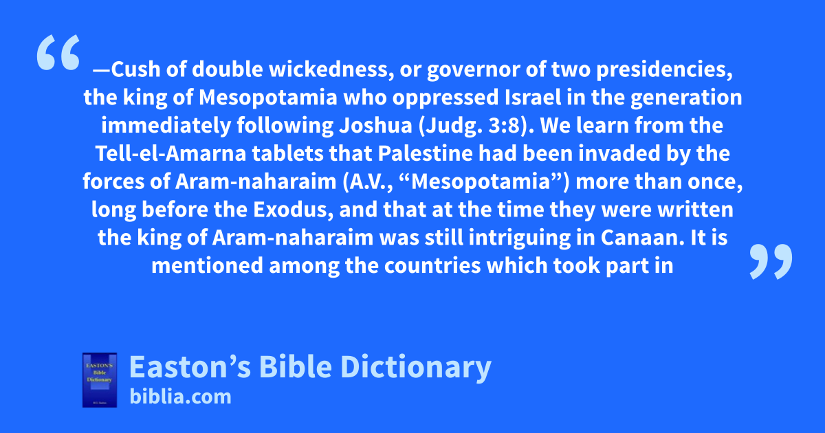 Chushan-Rishathaim—Cush of double wickedness, or governor of two presidencies, the king of Mesopotamia who oppressed Israel in the generation immediately following Joshua (Judg. 3:8). We learn from the Tell-el-Amarna tablets that Palestine had been invaded by the forces of Aram-naharaim (A.V., “Mesopotamia”) more than once, long before the Exodus, and that at the time they were written the king of Aram-naharaim was still intriguing in Canaan. It is mentioned among the countries which took part in the attack upon Egypt in the reign of Rameses III. (of the Twentieth Dynasty), but as its king is not one of the princes stated to have been conquered by the Pharaoh, it would seem that he did not actually enter Egypt. As the reign of Rameses III. corresponds with the Israelitish occupation of Canaan, it is probable that the Egyptian monuments refer to the oppression of the Israelites by Chushan-rishathaim. Canaan was still regarded as a province of Egypt, so that, in attacking it Chushan-rishathaim would have been considered to be attacking Egypt.