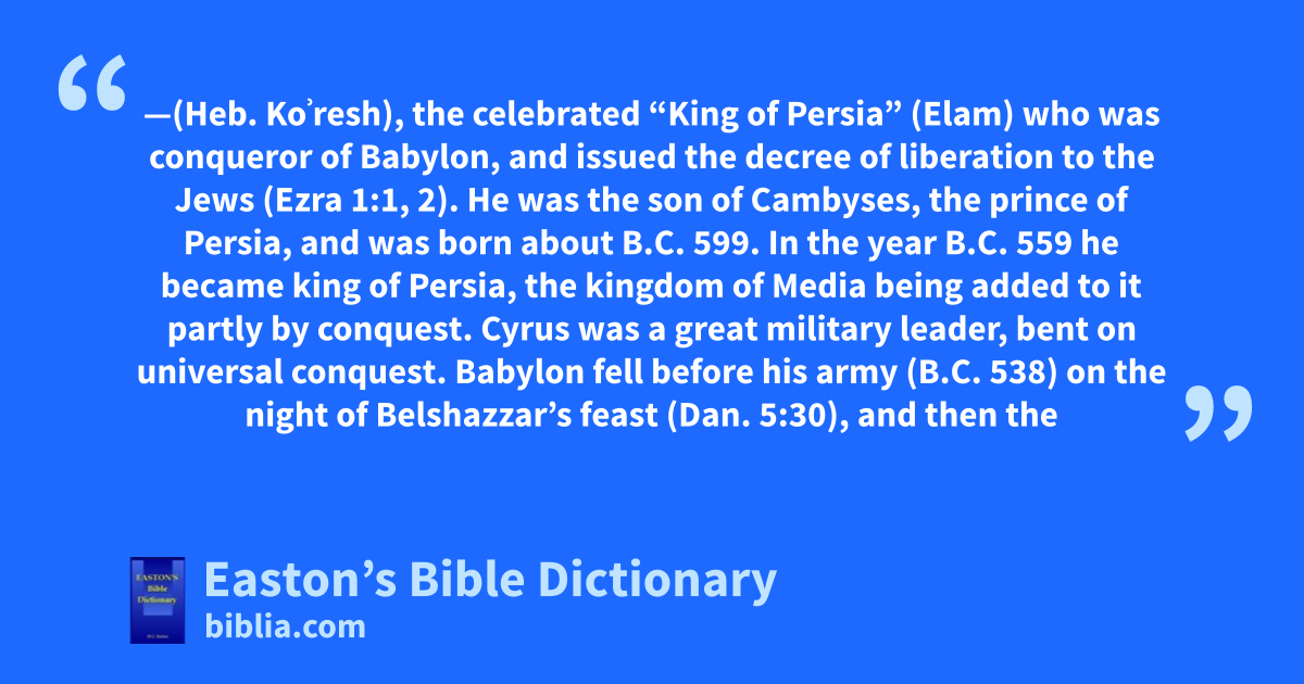 Cyrus—(Heb. Koʾresh), the celebrated “King of Persia” (Elam) who was conqueror of Babylon, and issued the decree of liberation to the Jews (Ezra 1:1, 2). He was the son of Cambyses, the prince of Persia, and was born about b.c. 599. In the year b.c. 559 he became king of Persia, the kingdom of Media being added to it partly by conquest. Cyrus was a great military leader, bent on universal conquest. Babylon fell before his army (b.c. 538) on the night of Belshazzar’s feast (Dan. 5:30), and then the ancient dominion of Assyria was also added to his empire (cf., “Go up, O Elam”, Isa 21:2).
