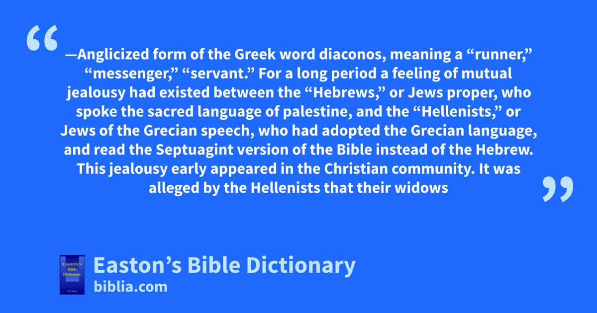 Deacon—Anglicized form of the Greek word diaconos, meaning a “runner,” “messenger,” “servant.” For a long period a feeling of mutual jealousy had existed between the “Hebrews,” or Jews proper, who spoke the sacred language of palestine, and the “Hellenists,” or Jews of the Grecian speech, who had adopted the Grecian language, and read the Septuagint version of the Bible instead of the Hebrew. This jealousy early appeared in the Christian community. It was alleged by the Hellenists that their widows were overlooked in the daily distribution of alms. This spirit must be checked. The apostles accordingly advised the disciples to look out for seven men of good report, full of the Holy Ghost, and men of practical wisdom, who should take entire charge of this distribution, leaving them free to devote themselves entirely to the spiritual functions of their office (Acts 6:1–6). This was accordingly done. Seven men were chosen, who appear from their names to have been Hellenists. The name “deacon” is nowhere applied to them in the New Testament; they are simply called “the seven” (21:8). Their office was at first secular, but it afterwards became also spiritual; for among other qualifications they must also be “apt to teach” (1 Tim. 3:8–12). Both Philip and Stephen, who were of “the seven,” preached; they did “the work of evangelists.”