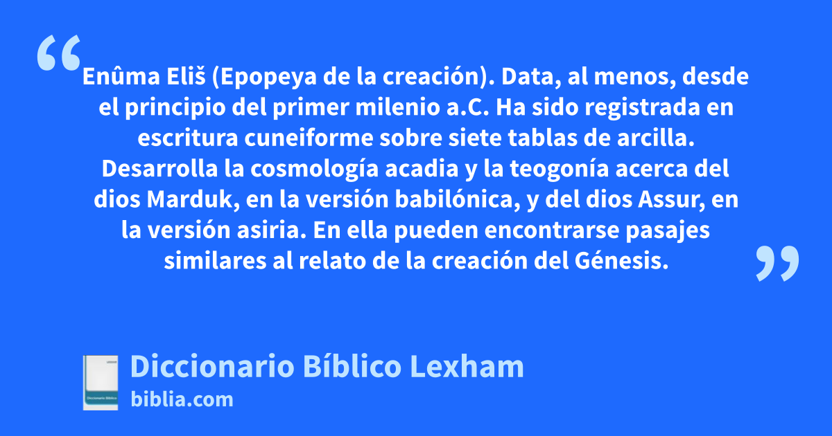 Enuma Elish Enûma Eliš (Epopeya de la creación). Data, al menos, desde el principio del primer milenio a.C. Ha sido registrada en escritura cuneiforme sobre siete tablas de arcilla. Desarrolla la cosmología acadia y la teogonía acerca del dios Marduk, en la versión babilónica, y del dios Assur, en la versión asiria. En ella pueden encontrarse pasajes similares al relato de la creación del Génesis.