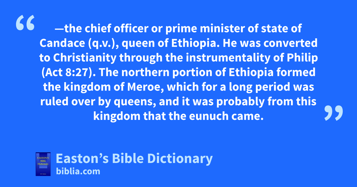 Ethiopian eunuch—the chief officer or prime minister of state of Candace (q.v.), queen of Ethiopia. He was converted to Christianity through the instrumentality of Philip (Act 8:27). The northern portion of Ethiopia formed the kingdom of Meroe, which for a long period was ruled over by queens, and it was probably from this kingdom that the eunuch came.