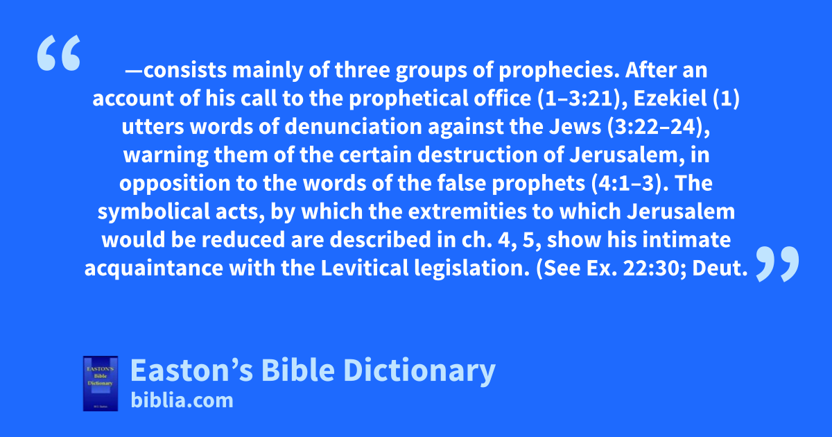 Ezekiel, Book of—consists mainly of three groups of prophecies. After an account of his call to the prophetical office (1–3:21), Ezekiel (1) utters words of denunciation against the Jews (3:22–24), warning them of the certain destruction of Jerusalem, in opposition to the words of the false prophets (4:1–3). The symbolical acts, by which the extremities to which Jerusalem would be reduced are described in ch. 4, 5, show his intimate acquaintance with the Levitical legislation. (See Ex. 22:30; Deut. 14:21; Lev. 5:2; 7:18, 24; 17:15; 19:7; 22:8, etc.)