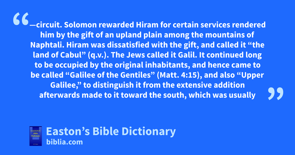 Galilee—circuit. Solomon rewarded Hiram for certain services rendered him by the gift of an upland plain among the mountains of Naphtali. Hiram was dissatisfied with the gift, and called it “the land of Cabul” (q.v.). The Jews called it Galil. It continued long to be occupied by the original inhabitants, and hence came to be called “Galilee of the Gentiles” (Matt. 4:15), and also “Upper Galilee,” to distinguish it from the extensive addition afterwards made to it toward the south, which was usually called “Lower Galilee.” In the time of our Lord, Galilee embraced more than one-third of Western Palestine, extending “from Dan on the north, at the base of Mount Hermon, to the ridges of Carmel and Gilboa on the south, and from the Jordan valley on the east away across the splendid plains of Jezreel and Acre to the shores of the Mediterranean on the west.” Palestine was divided into three provinces, Judea, Samaria, and Galilee, which comprehended the whole northern section of the country (Acts 9:31), and was the largest of the three.