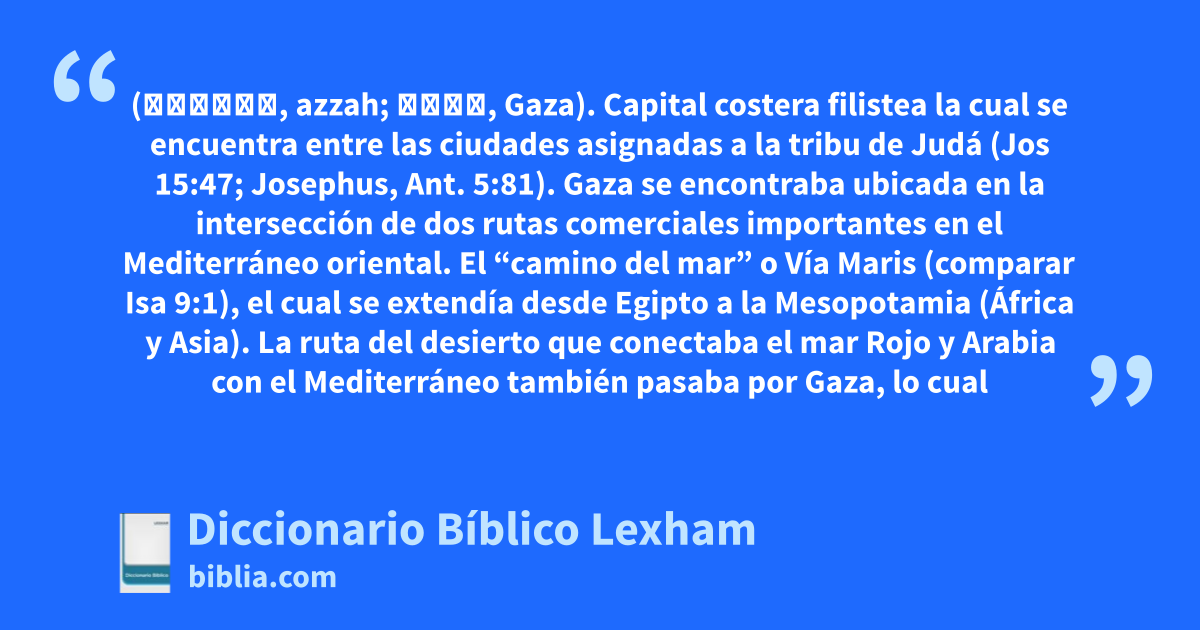 Gaza (עַזָּה, azzah; Γάζα, Gaza). Capital costera filistea la cual se encuentra entre las ciudades asignadas a la tribu de Judá (Jos 15:47; Josephus, Ant. 5:81). Gaza se encontraba ubicada en la intersección de dos rutas comerciales importantes en el Mediterráneo oriental. El “camino del mar” o Vía Maris (comparar Isa 9:1), el cual se extendía desde Egipto a la Mesopotamia (África y Asia). La ruta del desierto que conectaba el mar Rojo y Arabia con el Mediterráneo también pasaba por Gaza, lo cual hizo que Gaza fuera una ciudad constantemente disputada.