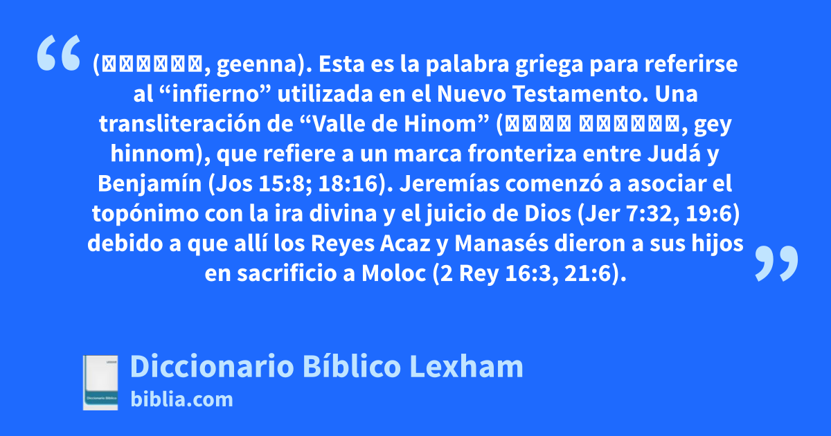 Gehenna (γέεννα, geenna). Esta es la palabra griega para referirse al “infierno” utilizada en el Nuevo Testamento. Una transliteración de “Valle de Hinom” (גֵּי הִנֹּם, gey hinnom), que refiere a un marca fronteriza entre Judá y Benjamín (Jos 15:8; 18:16). Jeremías comenzó a asociar el topónimo con la ira divina y el juicio de Dios (Jer 7:32, 19:6) debido a que allí los Reyes Acaz y Manasés dieron a sus hijos en sacrificio a Moloc (2 Rey 16:3, 21:6).