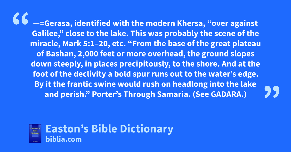 Gergesa—=Gerasa, identified with the modern Khersa, “over against Galilee,” close to the lake. This was probably the scene of the miracle, Mark 5:1–20, etc. “From the base of the great plateau of Bashan, 2,000 feet or more overhead, the ground slopes down steeply, in places precipitously, to the shore. And at the foot of the declivity a bold spur runs out to the water’s edge. By it the frantic swine would rush on headlong into the lake and perish.” Porter’s Through Samaria. (See GADARA.)