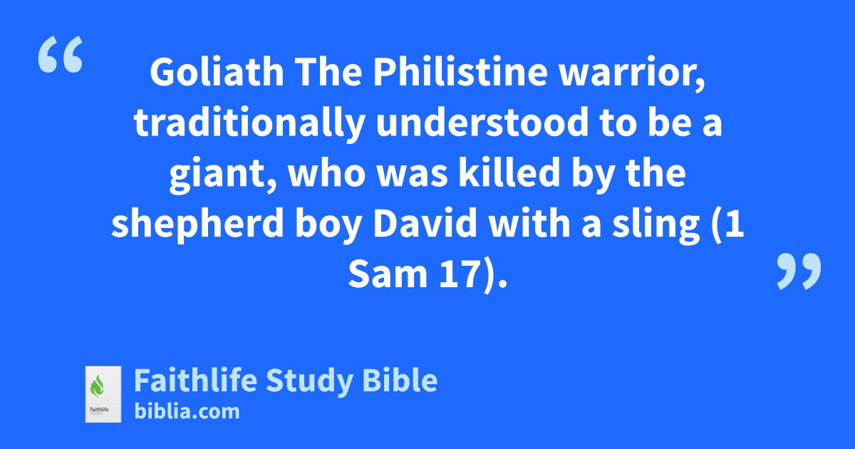 Goliath The Philistine warrior, traditionally understood to be a giant, who was killed by the shepherd boy David with a sling (1 Sam 17).