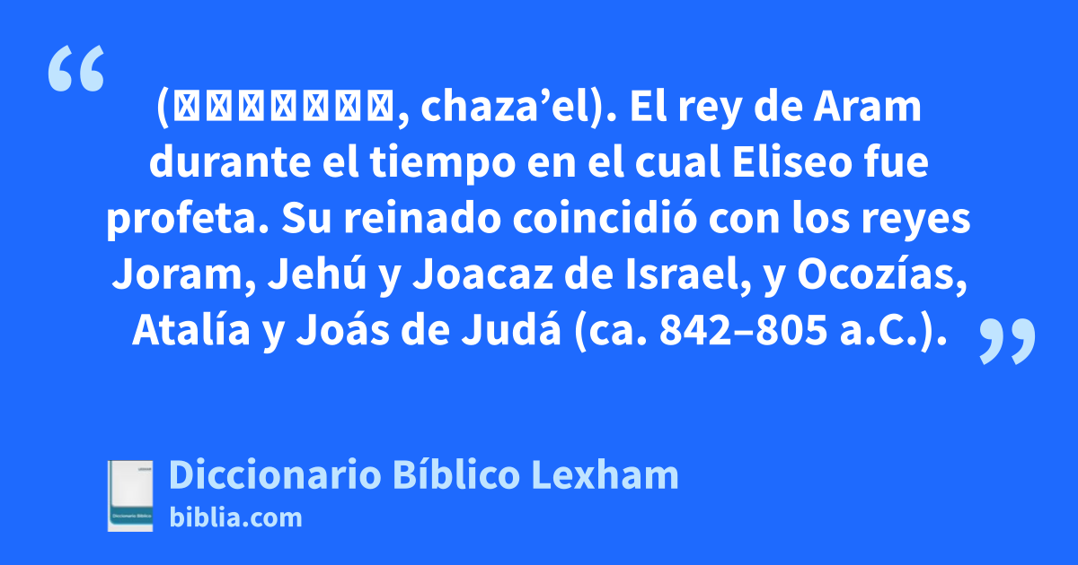 Hazael (חֲזָאֵל, chaza’el). El rey de Aram durante el tiempo en el cual Eliseo fue profeta. Su reinado coincidió con los reyes Joram, Jehú y Joacaz de Israel, y Ocozías, Atalía y Joás de Judá (ca. 842–805 a.C.).