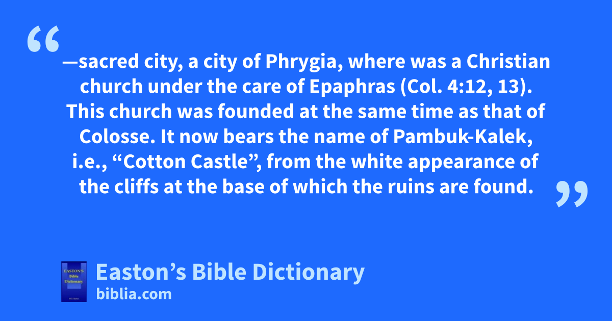 Hierapolis—sacred city, a city of Phrygia, where was a Christian church under the care of Epaphras (Col. 4:12, 13). This church was founded at the same time as that of Colosse. It now bears the name of Pambuk-Kalek, i.e., “Cotton Castle”, from the white appearance of the cliffs at the base of which the ruins are found.