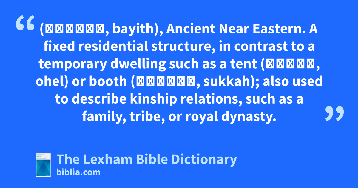 House, Ancient Near Eastern (בַּיִת, bayith), Ancient Near Eastern. A fixed residential structure, in contrast to a temporary dwelling such as a tent (אֺהֶל, ohel) or booth (סֻכָּה, sukkah); also used to describe kinship relations, such as a family, tribe, or royal dynasty.