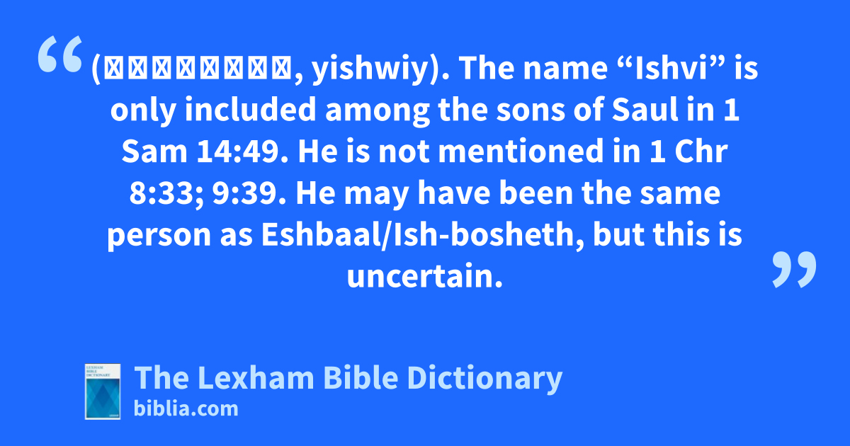Ishvi, Son of Saul (יִשְׁוִי, yishwiy). The name “Ishvi” is only included among the sons of Saul in 1 Sam 14:49. He is not mentioned in 1 Chr 8:33; 9:39. He may have been the same person as Eshbaal/Ish-bosheth, but this is uncertain.