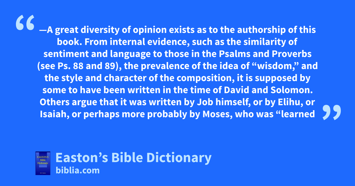 Job, Book of—A great diversity of opinion exists as to the authorship of this book. From internal evidence, such as the similarity of sentiment and language to those in the Psalms and Proverbs (see Ps. 88 and 89), the prevalence of the idea of “wisdom,” and the style and character of the composition, it is supposed by some to have been written in the time of David and Solomon. Others argue that it was written by Job himself, or by Elihu, or Isaiah, or perhaps more probably by Moses, who was “learned in all the wisdom of the Egyptians, and mighty in words and deeds” (Acts 7:22). He had opportunities in Midian for obtaining the knowledge of the facts related. But the authorship is altogether uncertain.