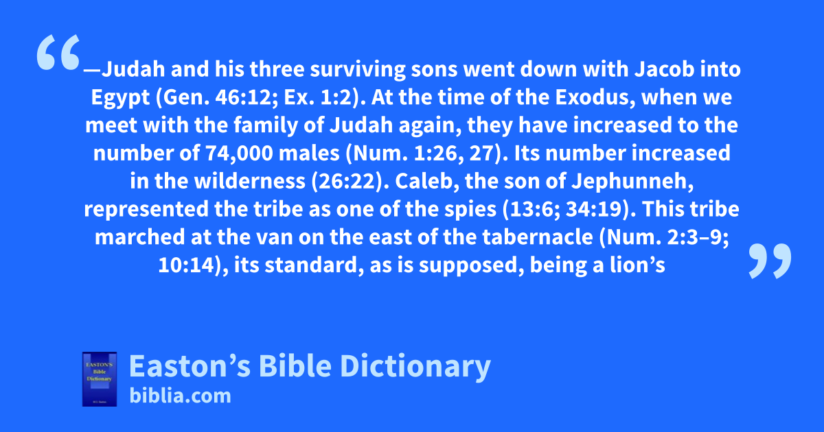 Judah, Tribe of—Judah and his three surviving sons went down with Jacob into Egypt (Gen. 46:12; Ex. 1:2). At the time of the Exodus, when we meet with the family of Judah again, they have increased to the number of 74,000 males (Num. 1:26, 27). Its number increased in the wilderness (26:22). Caleb, the son of Jephunneh, represented the tribe as one of the spies (13:6; 34:19). This tribe marched at the van on the east of the tabernacle (Num. 2:3–9; 10:14), its standard, as is supposed, being a lion’s whelp. Under Caleb, during the wars of conquest, they conquered that portion of the country which was afterwards assigned to them as their inheritance. This was the only case in which any tribe had its inheritance thus determined (Josh. 14:6–15; 15:13–19).