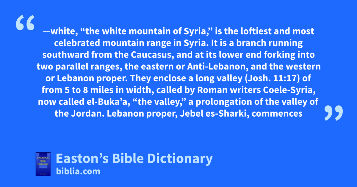 Lebanon—white, “the white mountain of Syria,” is the loftiest and most celebrated mountain range in Syria. It is a branch running southward from the Caucasus, and at its lower end forking into two parallel ranges, the eastern or Anti-Lebanon, and the western or Lebanon proper. They enclose a long valley (Josh. 11:17) of from 5 to 8 miles in width, called by Roman writers Coele-Syria, now called el-Buka’a, “the valley,” a prolongation of the valley of the Jordan.