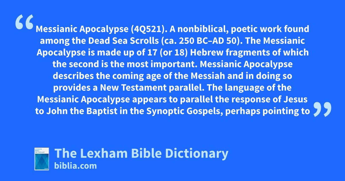 Messianic Apocalypse Messianic Apocalypse (4Q521). A nonbiblical, poetic work found among the Dead Sea Scrolls (ca. 250 bc–ad 50). The Messianic Apocalypse is made up of 17 (or 18) Hebrew fragments of which the second is the most important. Messianic Apocalypse describes the coming age of the Messiah and in doing so provides a New Testament parallel.