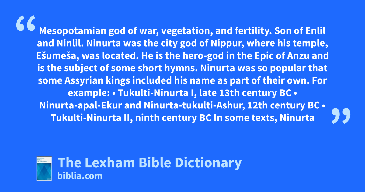 Ninurta Mesopotamian god of war, vegetation, and fertility. Son of Enlil and Ninlil. Ninurta was the city god of Nippur, where his temple, Ešumeša, was located. He is the hero-god in the Epic of Anzu and is the subject of some short hymns.