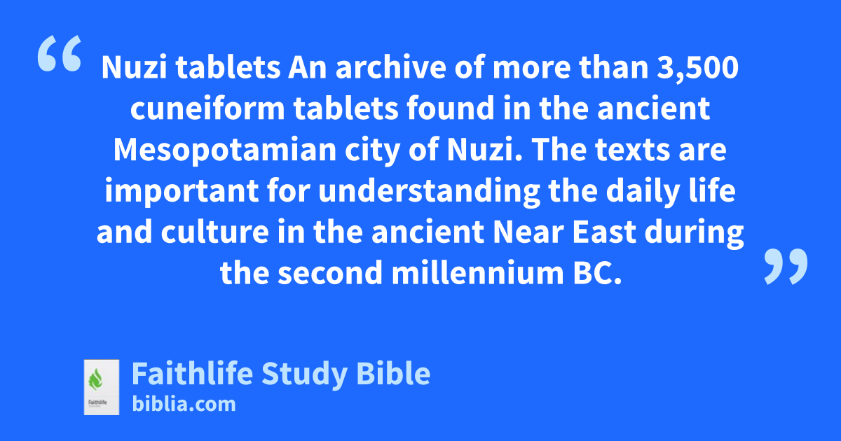 Nuzi tablets An archive of more than 3,500 cuneiform tablets found in the ancient Mesopotamian city of Nuzi. The texts are important for understanding the daily life and culture in the ancient Near East during the second millennium bc.