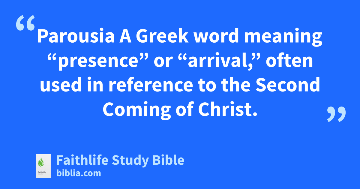 Parousia A Greek word meaning “presence” or “arrival,” often used in reference to the Second Coming of Christ.