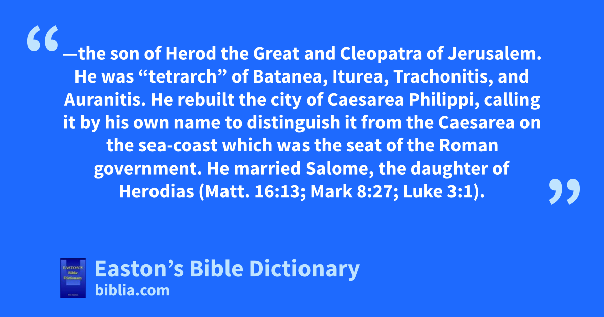 Herod Philip II.—the son of Herod the Great and Cleopatra of Jerusalem. He was “tetrarch” of Batanea, Iturea, Trachonitis, and Auranitis. He rebuilt the city of Caesarea Philippi, calling it by his own name to distinguish it from the Caesarea on the sea-coast which was the seat of the Roman government. He married Salome, the daughter of Herodias (Matt. 16:13; Mark 8:27; Luke 3:1).