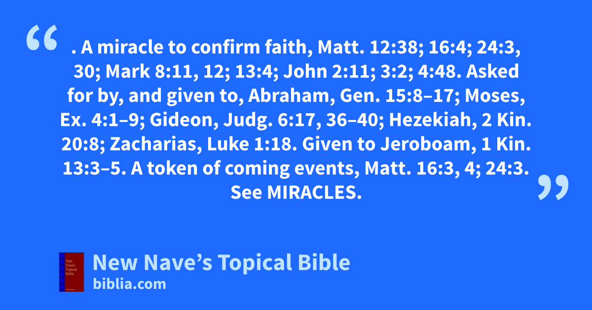 SIGN. A miracle to confirm faith, Matt. 12:38; 16:4; 24:3, 30; Mark 8:11, 12; 13:4; John 2:11; 3:2; 4:48. Asked for by, and given to, Abraham, Gen. 15:8–17; Moses, Ex. 4:1–9; Gideon, Judg. 6:17, 36–40; Hezekiah, 2 Kin. 20:8; Zacharias, Luke 1:18. Given to Jeroboam, 1 Kin. 13:3–5. A token of coming events, Matt. 16:3, 4; 24:3. See Miracles.