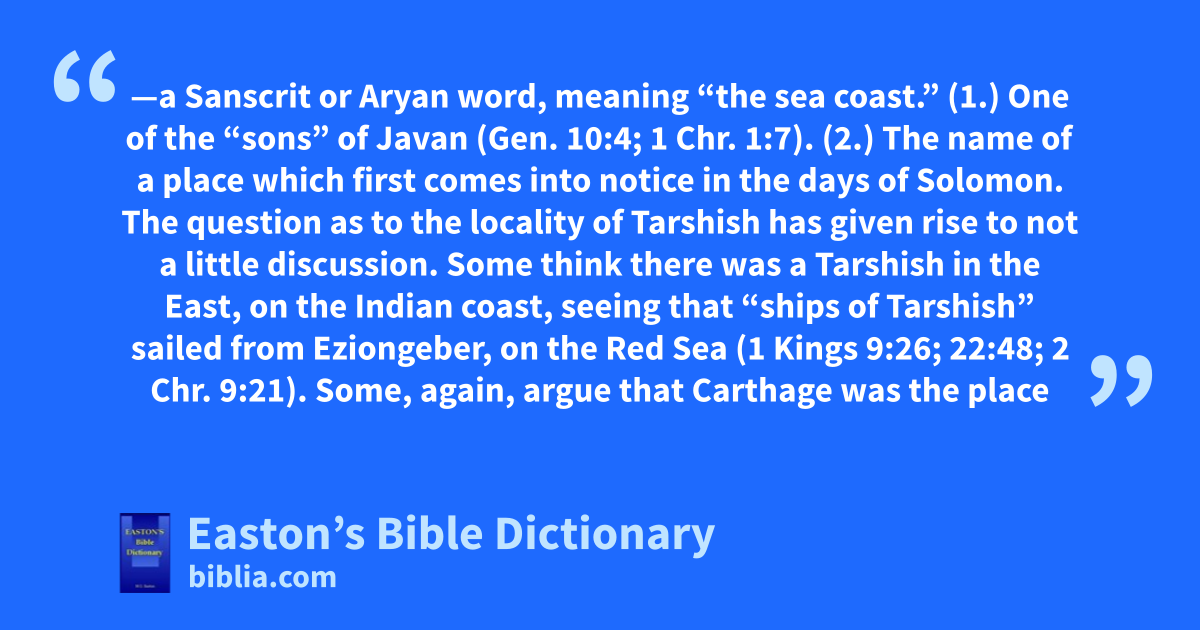 Tarshish—a Sanscrit or Aryan word, meaning “the sea coast.” (1.) One of the “sons” of Javan (Gen. 10:4; 1 Chr. 1:7).