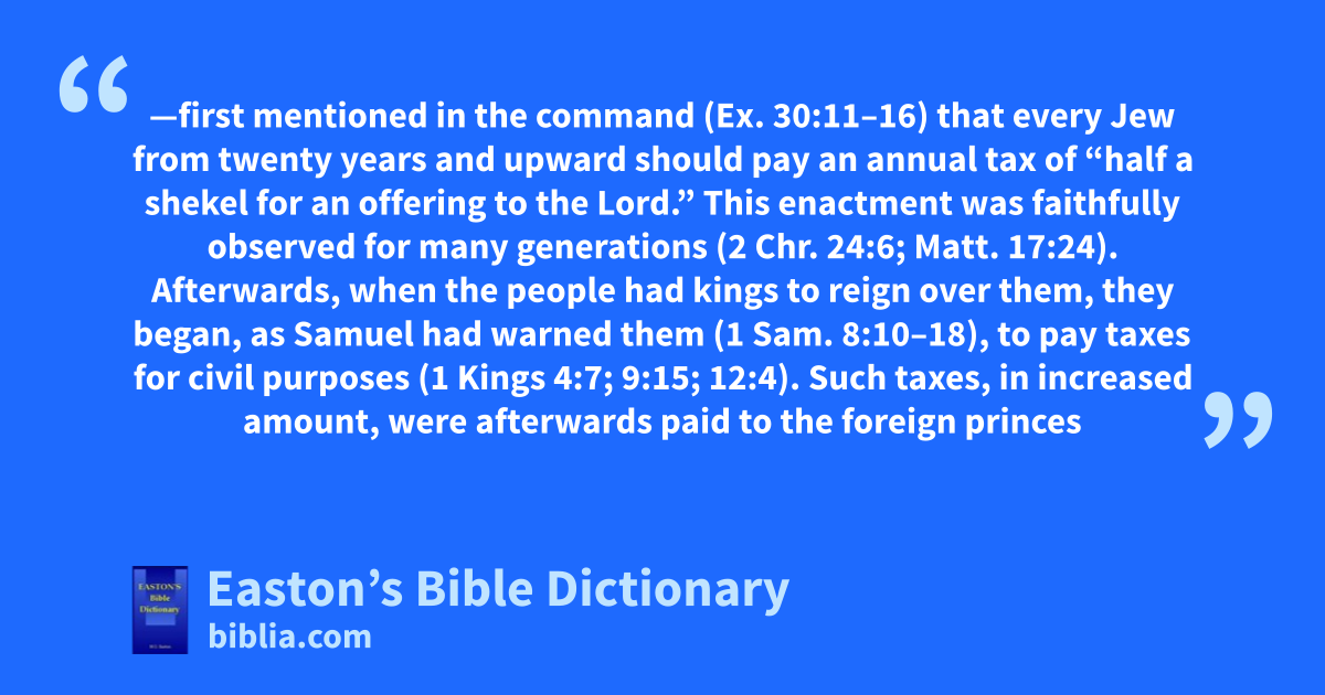 Taxes—first mentioned in the command (Ex. 30:11–16) that every Jew from twenty years and upward should pay an annual tax of “half a shekel for an offering to the Lord.” This enactment was faithfully observed for many generations (2 Chr. 24:6; Matt. 17:24).