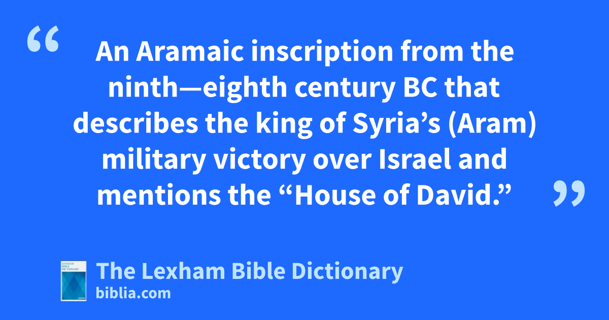 Tel Dan Stele An Aramaic inscription from the ninth—eighth century bc that describes the king of Syria’s (Aram) military victory over Israel and mentions the “House of David.”