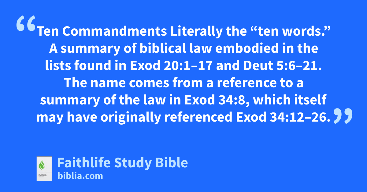 Ten Commandments Literally the “ten words.” A summary of biblical law embodied in the lists found in Exod 20:1–17 and Deut 5:6–21. The name comes from a reference to a summary of the law in Exod 34:8, which itself may have originally referenced Exod 34:12–26.