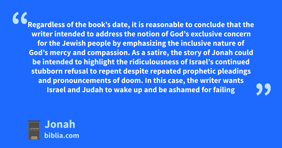 Regardless of the book’s date, it is reasonable to conclude that the writer intended to address the notion of God’s exclusive concern for the Jewish people by emphasizing the inclusive nature of God’s mercy and compassion. As a satire, the story of Jonah could be intended to highlight the ridiculousness of Israel’s continued stubborn refusal to repent despite repeated prophetic pleadings and pronouncements of doom. In this case, the writer wants Israel and Judah to wake up and be ashamed for failing