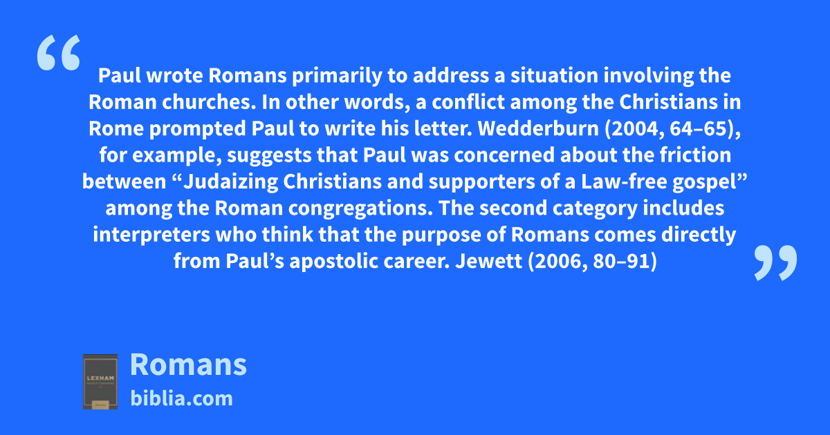 Paul wrote Romans primarily to address a situation involving the Roman churches. In other words, a conflict among the Christians in Rome prompted Paul to write his letter. Wedderburn (2004, 64–65), for example, suggests that Paul was concerned about the friction between “Judaizing Christians and supporters of a Law-free gospel” among the Roman congregations. The second category includes interpreters who think that the purpose of Romans comes directly from Paul’s apostolic career. Jewett (2006, 80–91)