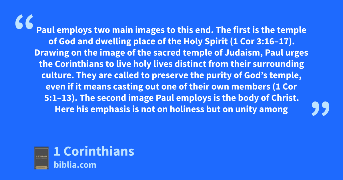 Paul employs two main images to this end. The first is the temple of God and dwelling place of the Holy Spirit (1 Cor 3:16–17). Drawing on the image of the sacred temple of Judaism, Paul urges the Corinthians to live holy lives distinct from their surrounding culture. They are called to preserve the purity of God’s temple, even if it means casting out one of their own members (1 Cor 5:1–13). The second image Paul employs is the body of Christ. Here his emphasis is not on holiness but on unity among