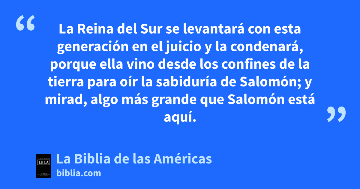 42 La Reina del Sura se levantará con esta generación en el juicio y la condenará, porque ella vino desde los confines de la tierra para oír la sabiduría de Salomón; y mirad, algo más grande que Salomón está aquíb.