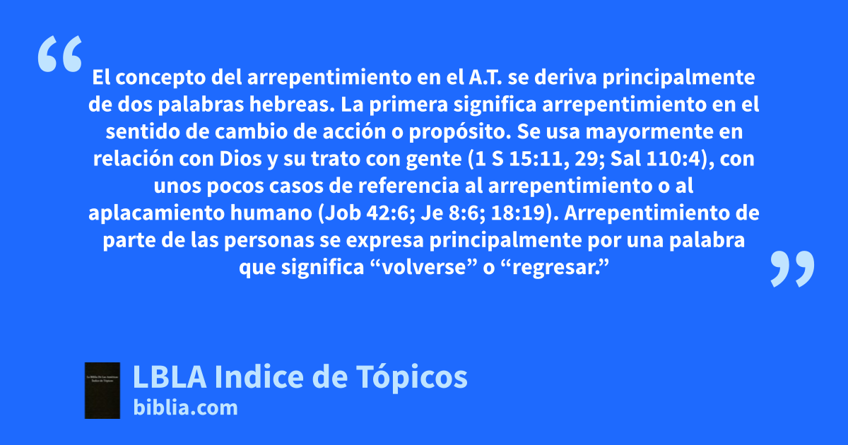 El concepto del arrepentimiento en el A.T. se deriva principalmente de dos palabras hebreas. La primera significa arrepentimiento en el sentido de cambio de acción o propósito. Se usa mayormente en relación con Dios y su trato con gente (1 S 15:11, 29; Sal 110:4), con unos pocos casos de referencia al arrepentimiento o al aplacamiento humano (Job 42:6; Je 8:6; 18:19). Arrepentimiento de parte de las personas se expresa principalmente por una palabra que significa “volverse” o “regresar.” Se usa la misma palabra para el concepto de conversión, indicando que estas dos ideas son casi sinónimas en el A.T.