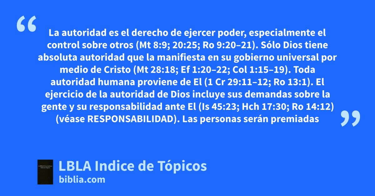 La autoridad es el derecho de ejercer poder, especialmente el control sobre otros (Mt 8:9; 20:25; Ro 9:20–21). Sólo Dios tiene absoluta autoridad que la manifiesta en su gobierno universal por medio de Cristo (Mt 28:18; Ef 1:20–22; Col 1:15–19). Toda autoridad humana proviene de El (1 Cr 29:11–12; Ro 13:1). El ejercicio de la autoridad de Dios incluye sus demandas sobre la gente y su responsabilidad ante El (Is 45:23; Hch 17:30; Ro 14:12) (véase RESPONSABILIDAD). Las personas serán premiadas por acatar la autoridad divina o castigadas por desobedecerla (Ro 2:4–8; 13:1–4; 1 Pe 2:13–14).
