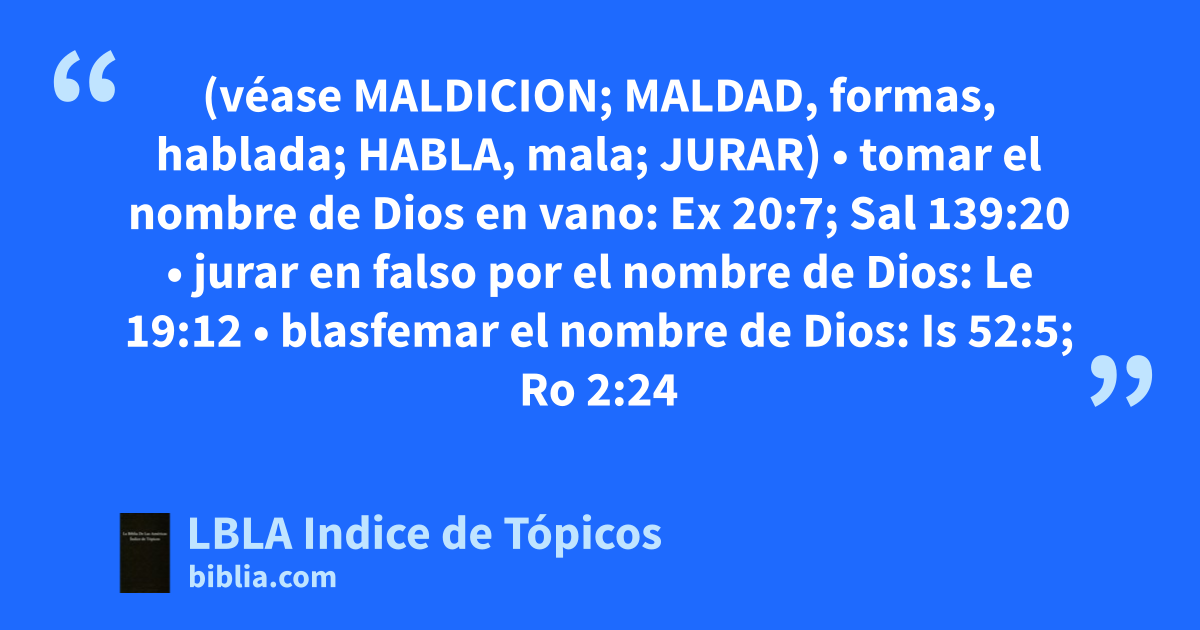 BLASFEMIA (véase MALDICION; MALDAD, formas, hablada; HABLA, mala; JURAR) • tomar el nombre de Dios en vano: Ex 20:7; Sal 139:20 • jurar en falso por el nombre de Dios: Le 19:12 • blasfemar el nombre de Dios: Is 52:5; Ro 2:24