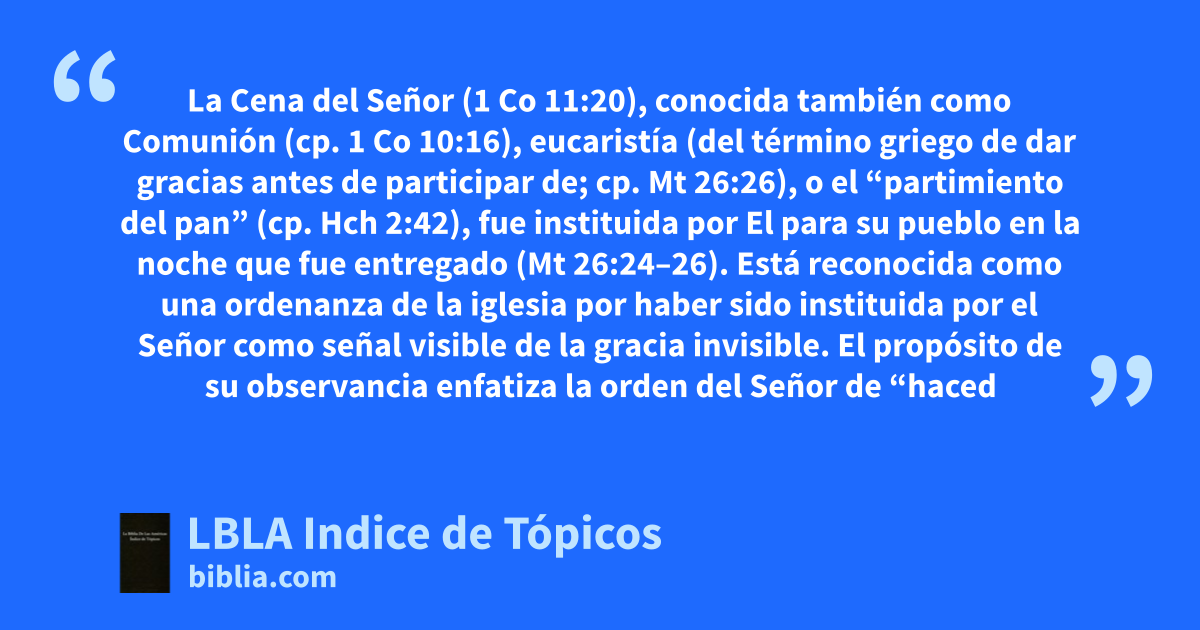 La Cena del Señor (1 Co 11:20), conocida también como Comunión (cp. 1 Co 10:16), eucaristía (del término griego de dar gracias antes de participar de; cp. Mt 26:26), o el “partimiento del pan” (cp. Hch 2:42), fue instituida por El para su pueblo en la noche que fue entregado (Mt 26:24–26). Está reconocida como una ordenanza de la iglesia por haber sido instituida por el Señor como señal visible de la gracia invisible. El propósito de su observancia enfatiza la orden del Señor de “haced esto en memoria de mí” (Lc 22:19). Es un medio por el cual el Cristo resucitado se hace presente a su pueblo en su gracia redentora. Hay varias interpretaciones de las declaraciones de Cristo en cuanto al pan y la copa como su cuerpo y su sangre (cp. Lc 22:19–20). Algunos lo interpretan literalmente, creyendo en la transformación milagrosa de los elementos. Otros lo entienden como simbólico de la presencia espiritual de Cristo como el que se da a sí mismo en su capacidad salvadora para el sustento espiritual de su pueblo.