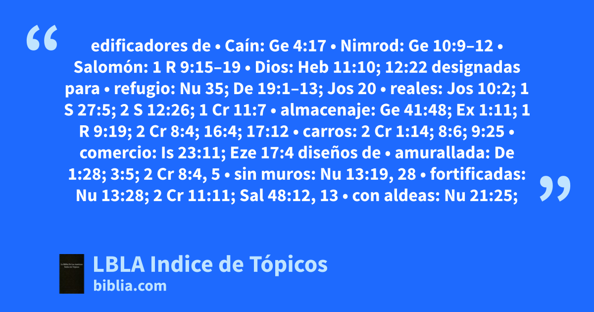 designadas para • refugio: Nu 35; De 19:1–13; Jos 20 • reales: Jos 10:2; 1 S 27:5; 2 S 12:26; 1 Cr 11:7 • almacenaje: Ge 41:48; Ex 1:11; 1 R 9:19; 2 Cr 8:4; 16:4; 17:12 • carros: 2 Cr 1:14; 8:6; 9:25 • comercio: Is 23:11; Eze 17:4