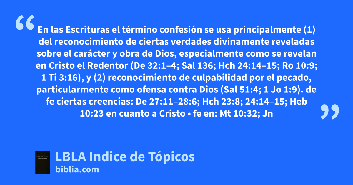 En las Escrituras el término confesión se usa principalmente (1) del reconocimiento de ciertas verdades divinamente reveladas sobre el carácter y obra de Dios, especialmente como se revelan en Cristo el Redentor (De 32:1–4; Sal 136; Hch 24:14–15; Ro 10:9; 1 Ti 3:16), y (2) reconocimiento de culpabilidad por el pecado, particularmente como ofensa contra Dios (Sal 51:4; 1 Jo 1:9).