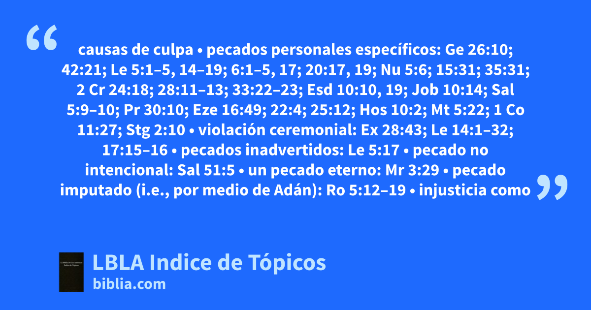 causas de culpa • pecados personales específicos: Ge 26:10; 42:21; Le 5:1–5, 14–19; 6:1–5, 17; 20:17, 19; Nu 5:6; 15:31; 35:31; 2 Cr 24:18; 28:11–13; 33:22–23; Esd 10:10, 19; Job 10:14; Sal 5:9–10; Pr 30:10; Eze 16:49; 22:4; 25:12; Hos 10:2; Mt 5:22; 1 Co 11:27; Stg 2:10 • violación ceremonial: Ex 28:43; Le 14:1–32; 17:15–16 • pecados inadvertidos: Le 5:17 • pecado no intencional: Sal 51:5 • un pecado eterno: Mr 3:29 • pecado imputado (i.e., por medio de Adán): Ro 5:12–19 • injusticia como pecado: 1 Jo 5:17 (cp. Is 64:6)