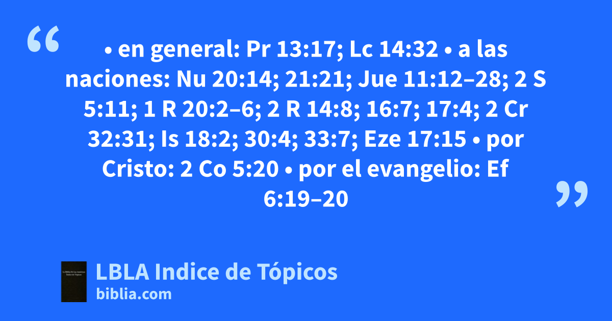 EMBAJADOR(ES) • en general: Pr 13:17; Lc 14:32 • a las naciones: Nu 20:14; 21:21; Jue 11:12–28; 2 S 5:11; 1 R 20:2–6; 2 R 14:8; 16:7; 17:4; 2 Cr 32:31; Is 18:2; 30:4; 33:7; Eze 17:15 • por Cristo: 2 Co 5:20 • por el evangelio: Ef 6:19–20