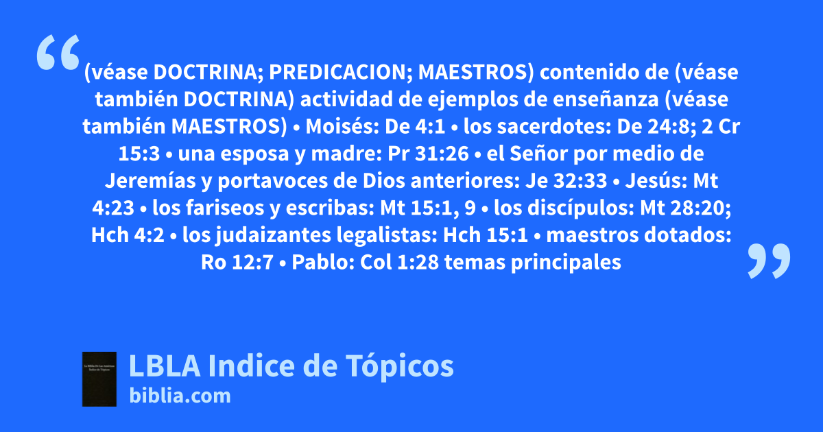 temas principales de enseñanza • la ley de Dios: Ex 18:20; De 4:1 • la verdad y los caminos de Dios: Sal 25:4–5 • la sabiduría de Dios: Pr 1:1–31:31 • los mandamientos de Cristo: Mt 28:20 • la oración: Lc 11:1 • la persona y obra de Cristo como Señor: Hch 4:2; 5:42; 20:21; 28:31; 1 Co 15:3–4 • la palabra de Dios en general: Hch 18:11; 2 Ti 3:16–17 • lo que es bueno: Tit 2:3 (cp. Ga 6:6)