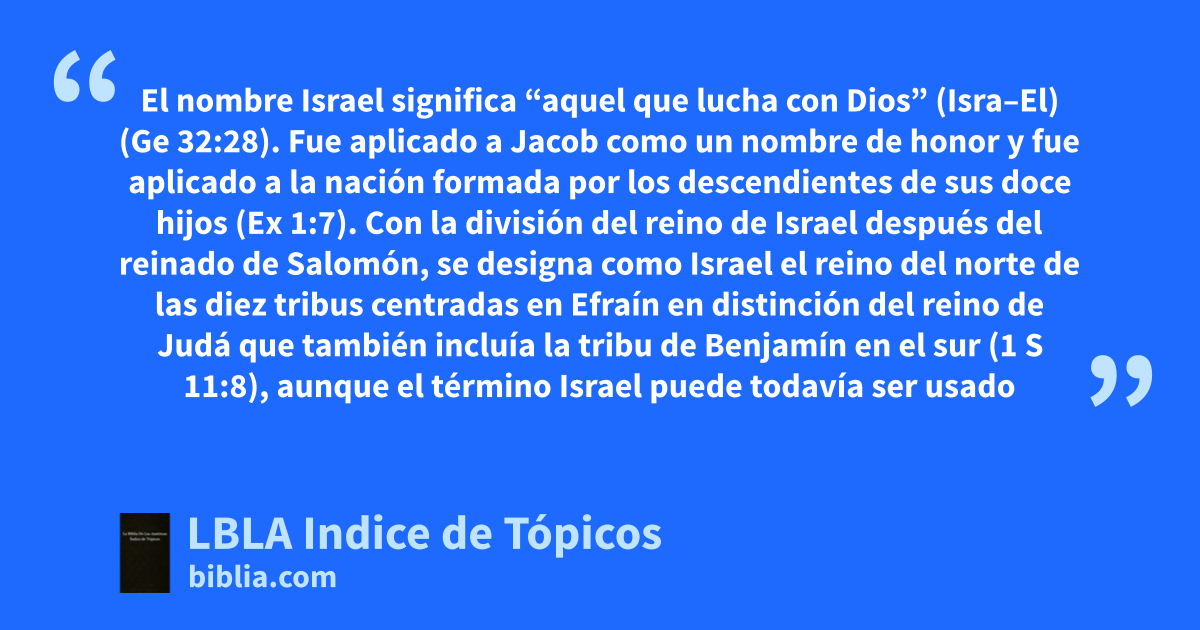 El nombre Israel significa “aquel que lucha con Dios” (Isra–El) (Ge 32:28). Fue aplicado a Jacob como un nombre de honor y fue aplicado a la nación formada por los descendientes de sus doce hijos (Ex 1:7). Con la división del reino de Israel después del reinado de Salomón, se designa como Israel el reino del norte de las diez tribus centradas en Efraín en distinción del reino de Judá que también incluía la tribu de Benjamín en el sur (1 S 11:8), aunque el término Israel puede todavía ser usado por toda la gente del pacto, aún después de que la monarquía se dividiera (Is 5:7). En el A.T. la nación de Israel fue formada particularmente por Dios como su pueblo especial en una relación de pacto con Dios (Ex 19:5–6). Los evangelios continúan dando el mismo uso al término Israel para el pueblo del pacto del A.T. Al rechazar al Mesías, como nación, algunos intérpretes consideran que Dios ha establecido a la iglesia como el nuevo Israel espiritual (Ga 6:16) en la cual todas las profecías concernientes a la restauración y bendición a todas las naciones serán cumplidas. Sin embargo, otros consideran que Israel retendrá el significado étnico y nacional del A.T. a través de toda la escritura y que las profecías concernientes a Israel que aún no se han cumplido, serán cumplidas por medio de ellos mismos (cp. Ro 11:24–29).
