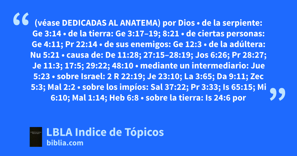 por Dios • de la serpiente: Ge 3:14 • de la tierra: Ge 3:17–19; 8:21 • de ciertas personas: Ge 4:11; Pr 22:14 • de sus enemigos: Ge 12:3 • de la adúltera: Nu 5:21 • causa de: De 11:28; 27:15–28:19; Jos 6:26; Pr 28:27; Je 11:3; 17:5; 29:22; 48:10 • mediante un intermediario: Jue 5:23 • sobre Israel: 2 R 22:19; Je 23:10; La 3:65; Da 9:11; Zec 5:3; Mal 2:2 • sobre los impíos: Sal 37:22; Pr 3:33; Is 65:15; Mi 6:10; Mal 1:14; Heb 6:8 • sobre la tierra: Is 24:6